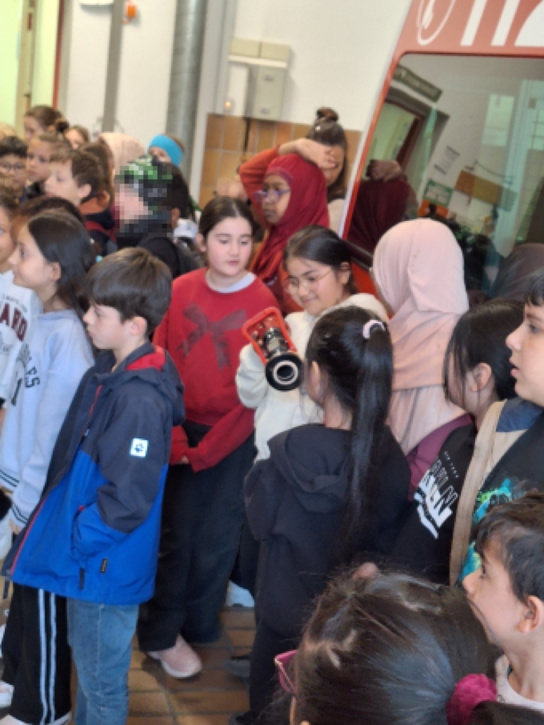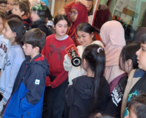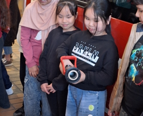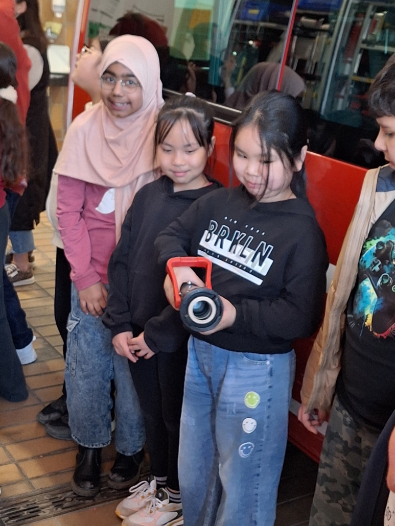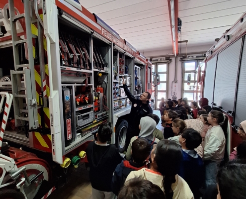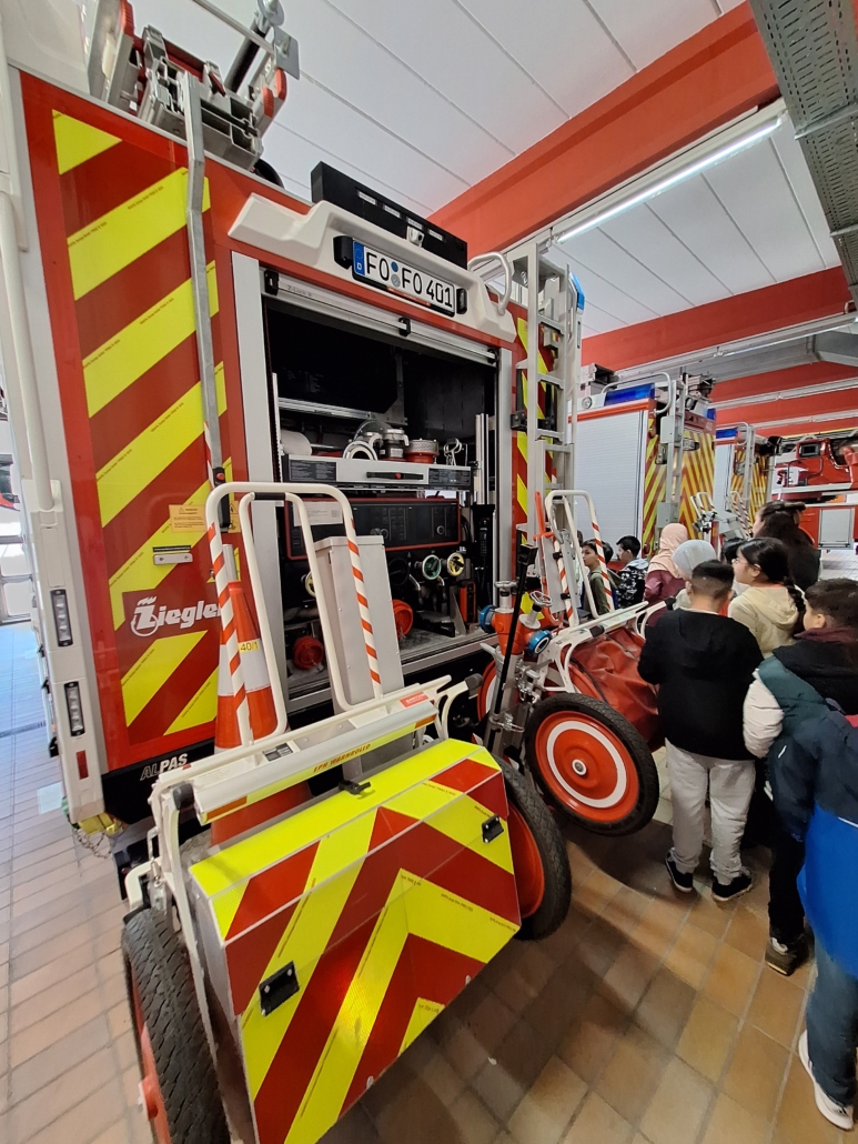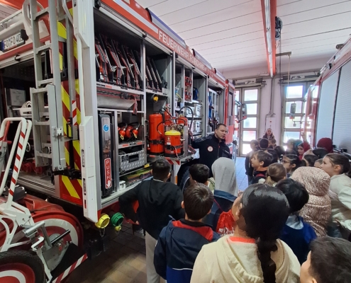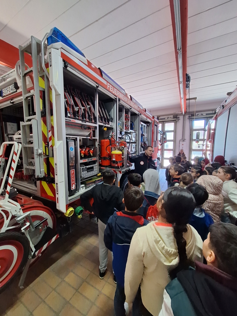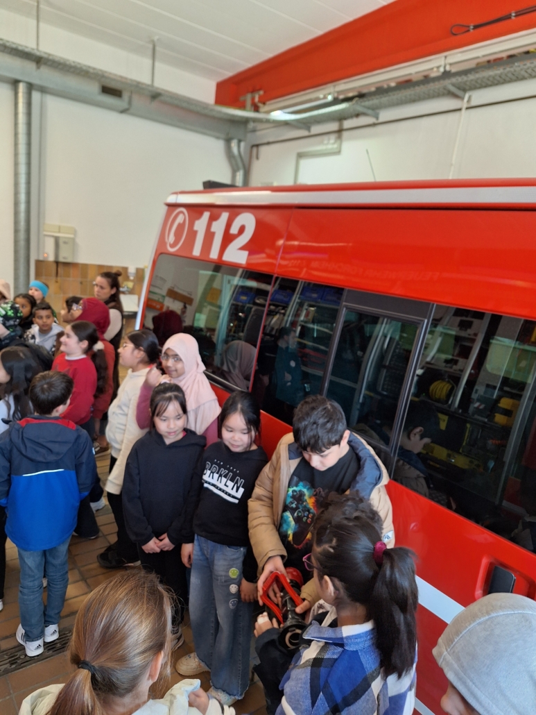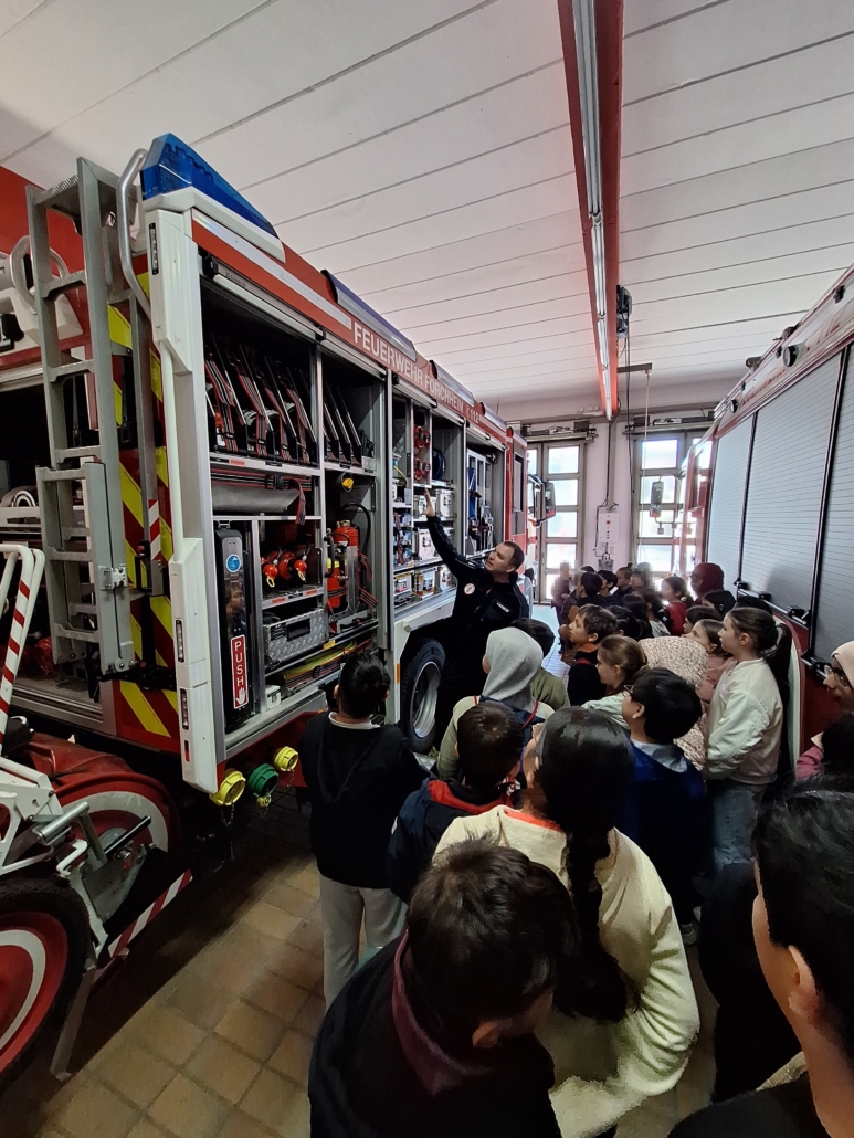 Besonders begeistert waren die Kinder von der Ausrüstung und den großen Einsatzfahrzeugen, die sie aus nächster Nähe bestaunen durften. Herr Szemeitat von der Feuerwehr erklärte anschaulich, wie Brände gelöscht, Menschen gerettet und Einsätze koordiniert werden. Ein besonderes Highlight war, dass extra für uns das Drehleiterfahrzeug aus der Garage gefahren wurde und wir so bestaunen konnten, wie hoch die Leiter ausgefahren werden kann.
