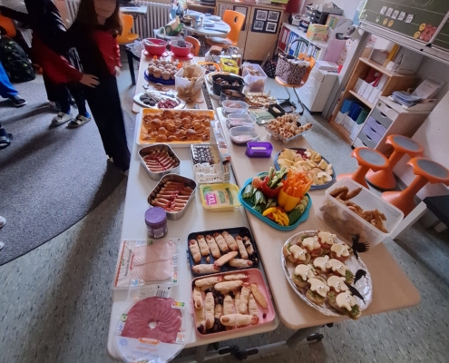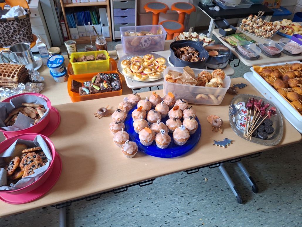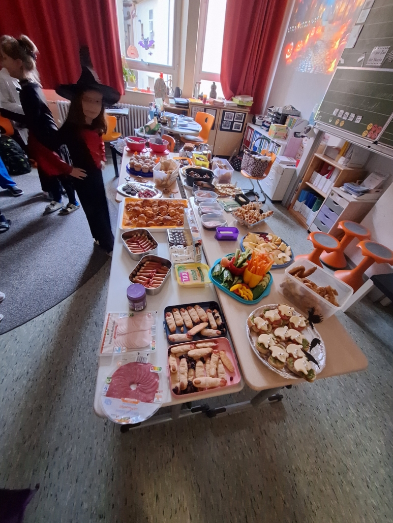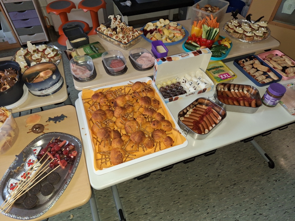 Im Klassenzimmer wartete ein bunt geschmücktes Buffet voller kreativer und gruseliger Leckereien: