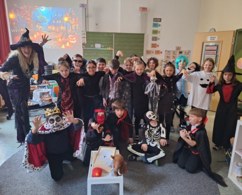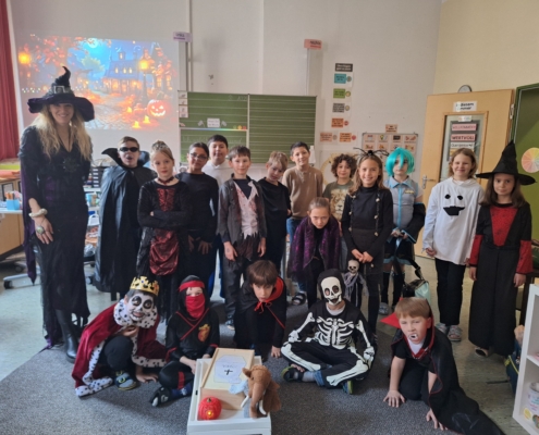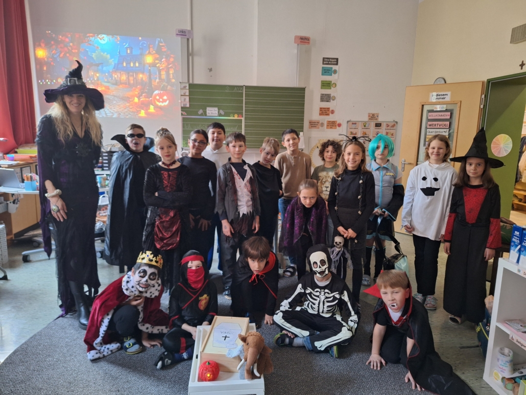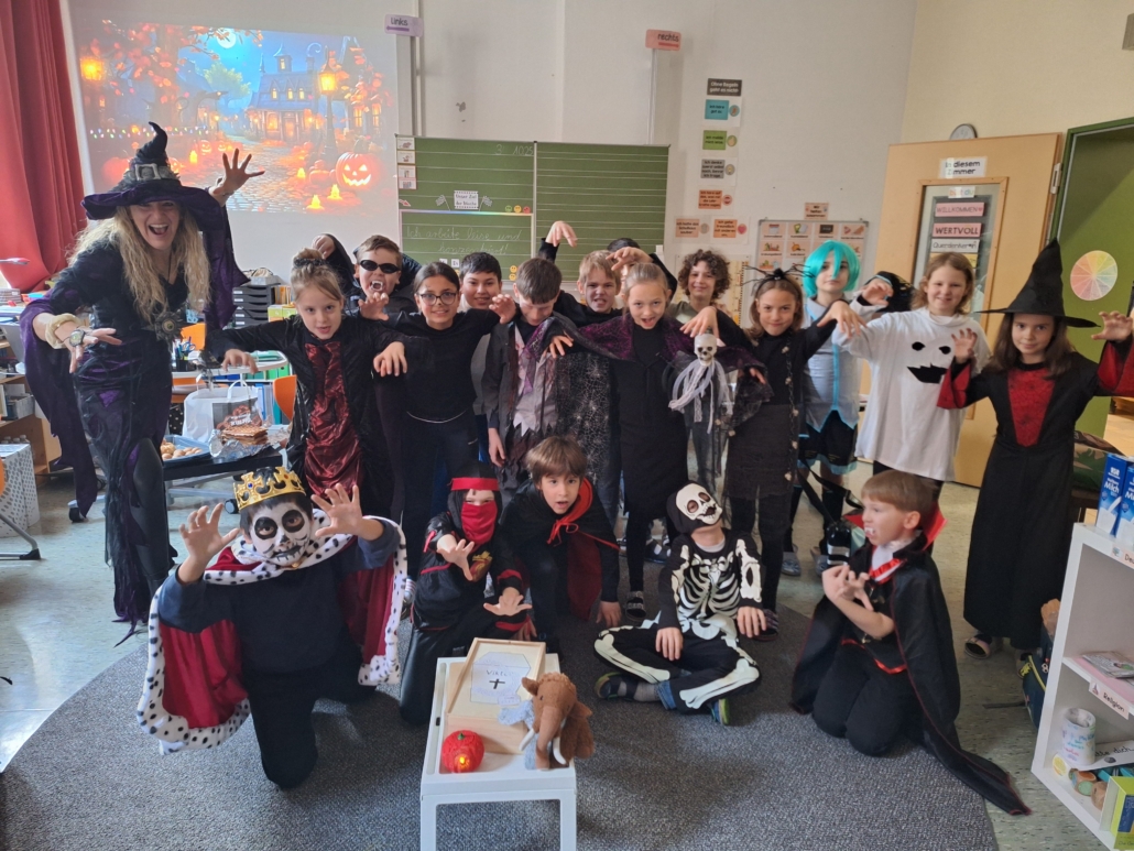 Die Klassen 4b und 4c feierten gemeinsam ein schaurig schönes Halloween-Frühstück! Schon früh am Morgen kamen kleine Hexen, Vampire, Skelette und andere gruselige Gestalten in die Schule – alle mit tollen Kostümen und viel guter Laune.