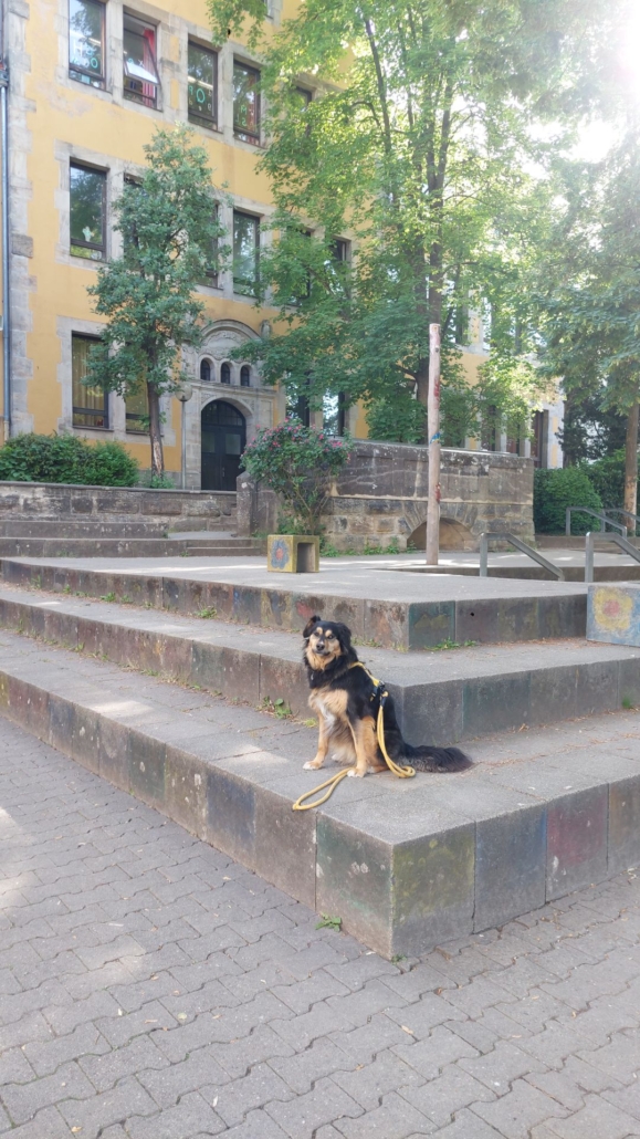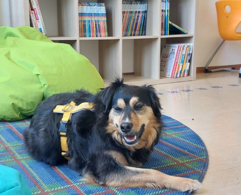 Kaya ist ein ausgebildeter Lesehund und begleitet unsere Förderlehrerin Frau Pfefferle regelmäßig im Unterricht.