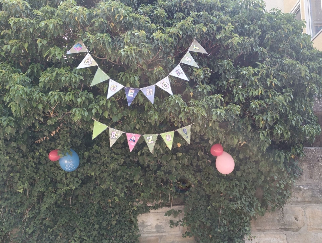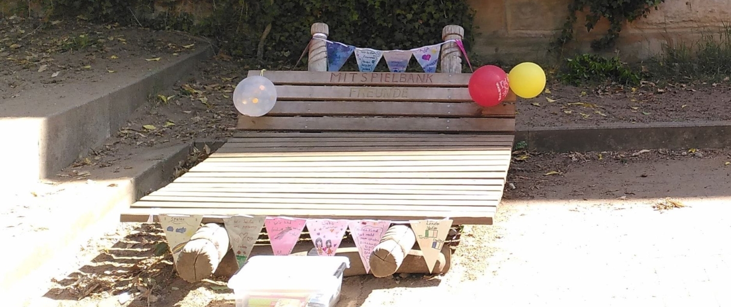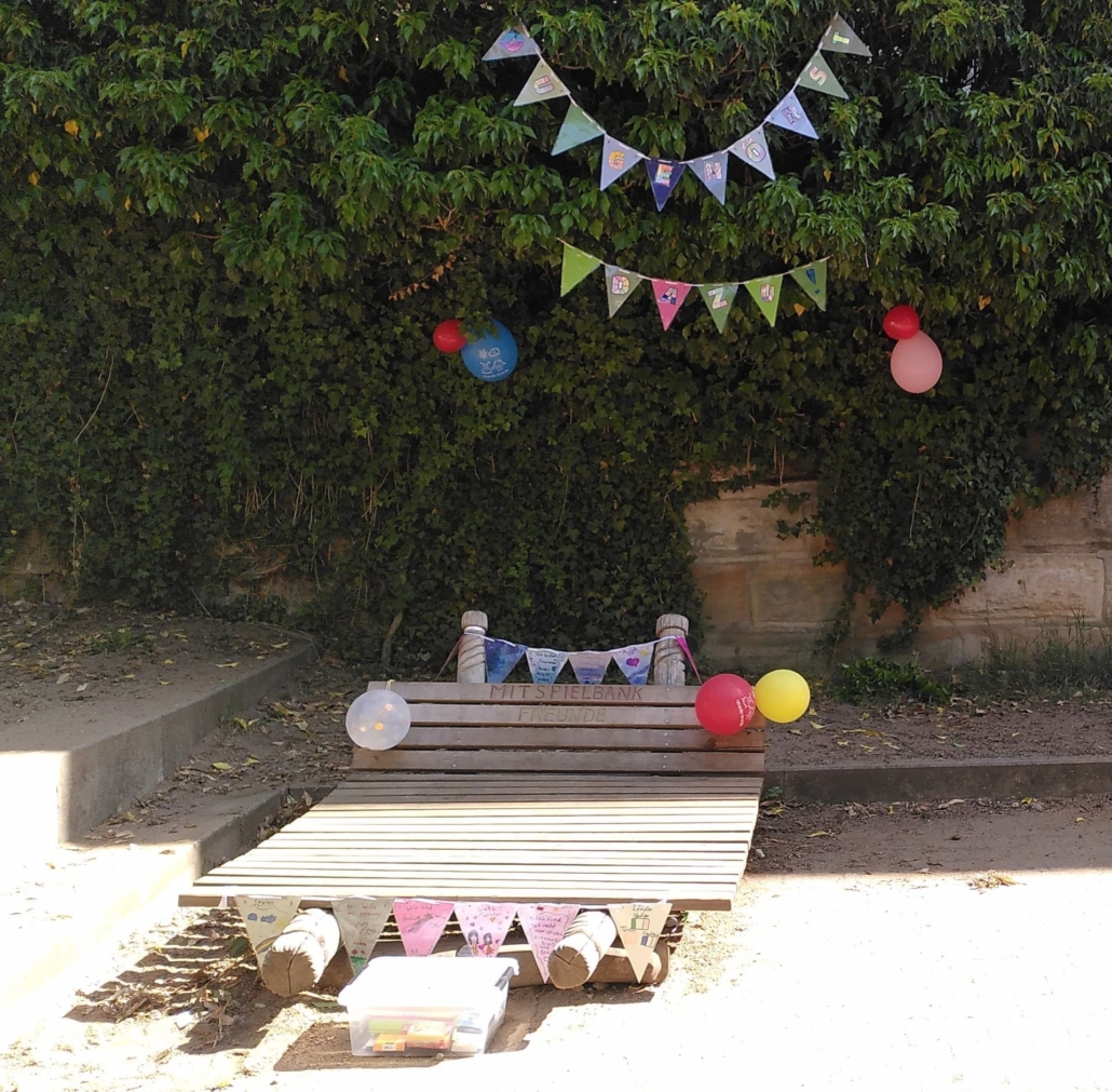Unsere Schule hat jetzt etwas ganz Besonderes auf dem Pausenhof: die Mitspielbank! Sie steht neben dem Sandkasten, ist nicht nur durch die Girlande darüber gut zu sehen und sie hilft Kindern, schnell neue Spielpartner zu finden.