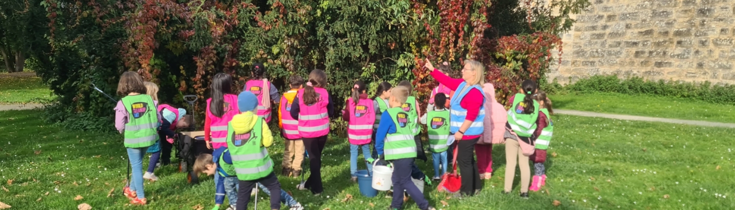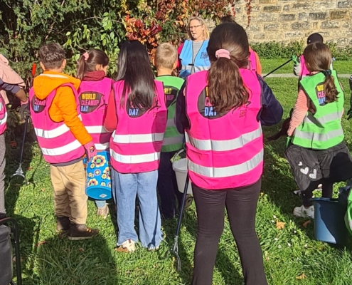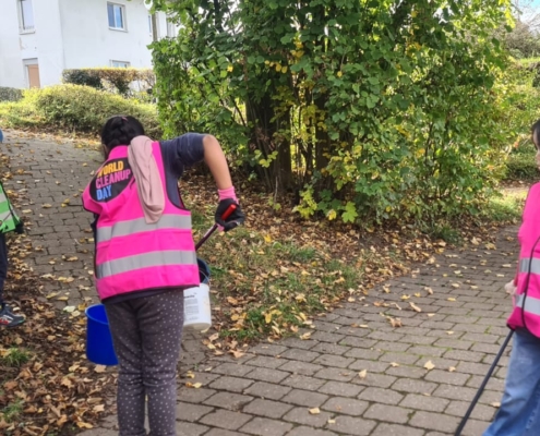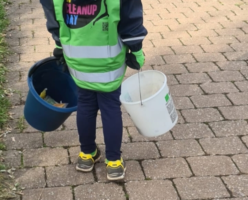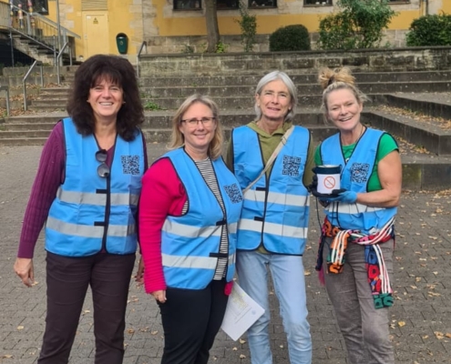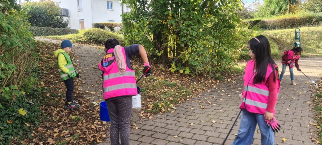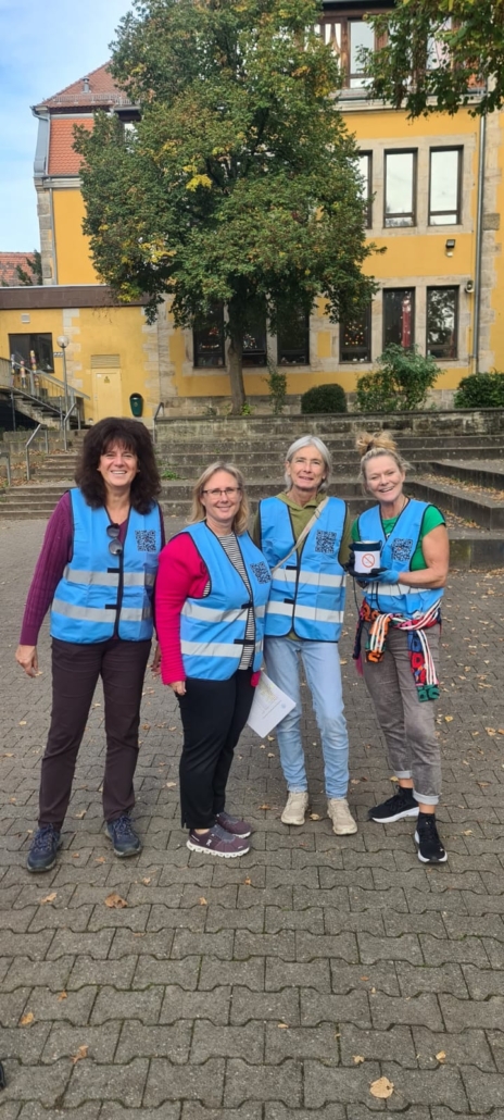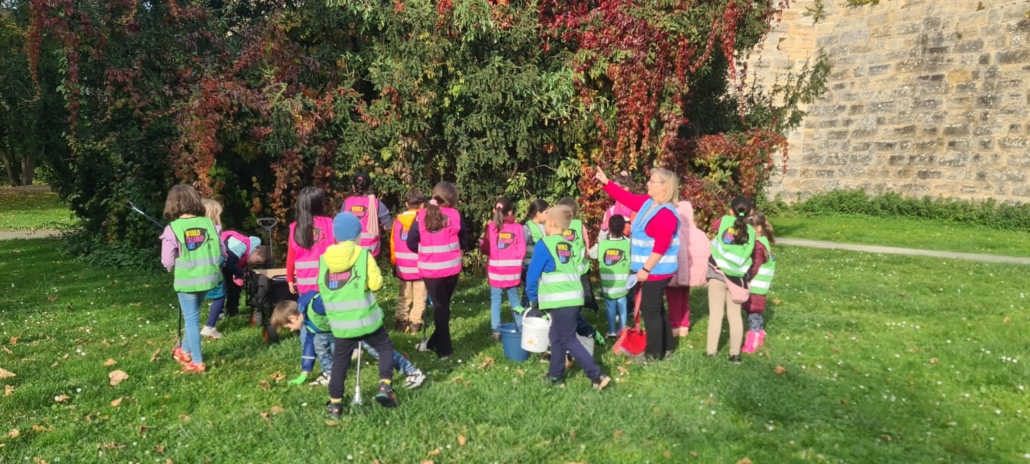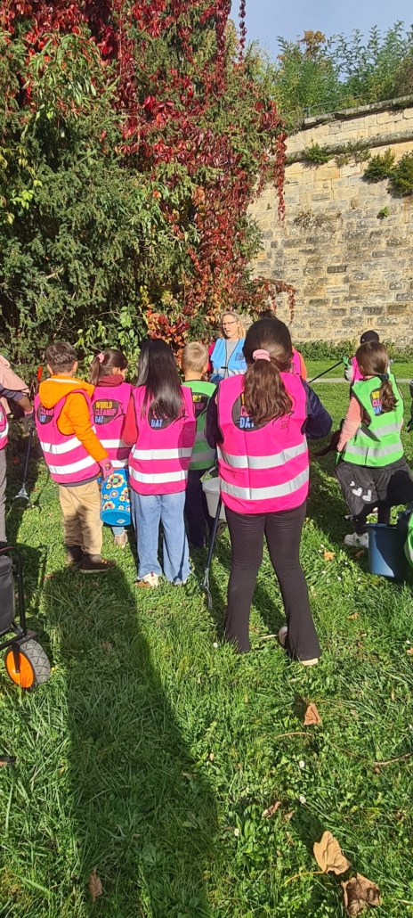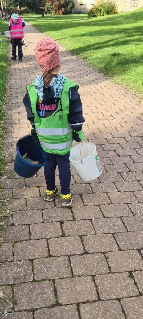 Also trafen wir uns am 17.10.2024 nachmittags im Pausenhof. Dort wurden wir ausgestattet mit Greifzangen, Handschuhen, Warnwesten und Eimern.