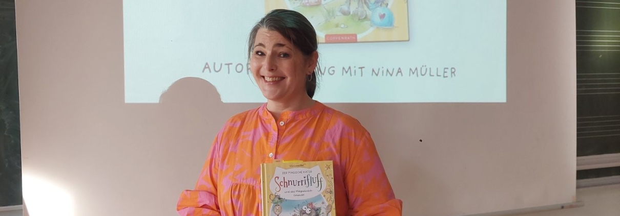 Im Rahmen des „Blätterwaldes“ verwandelte sich die Martinschule für einen Vormittag in einen Ort voller Funken, Fantasie und Katzenmagie. Die beliebte Kinderbuchautorin Nina Müller war zu Gast – und natürlich durfte ihr berühmter Gefährte Schnurrifluff, der magische Kater, nicht fehlen.