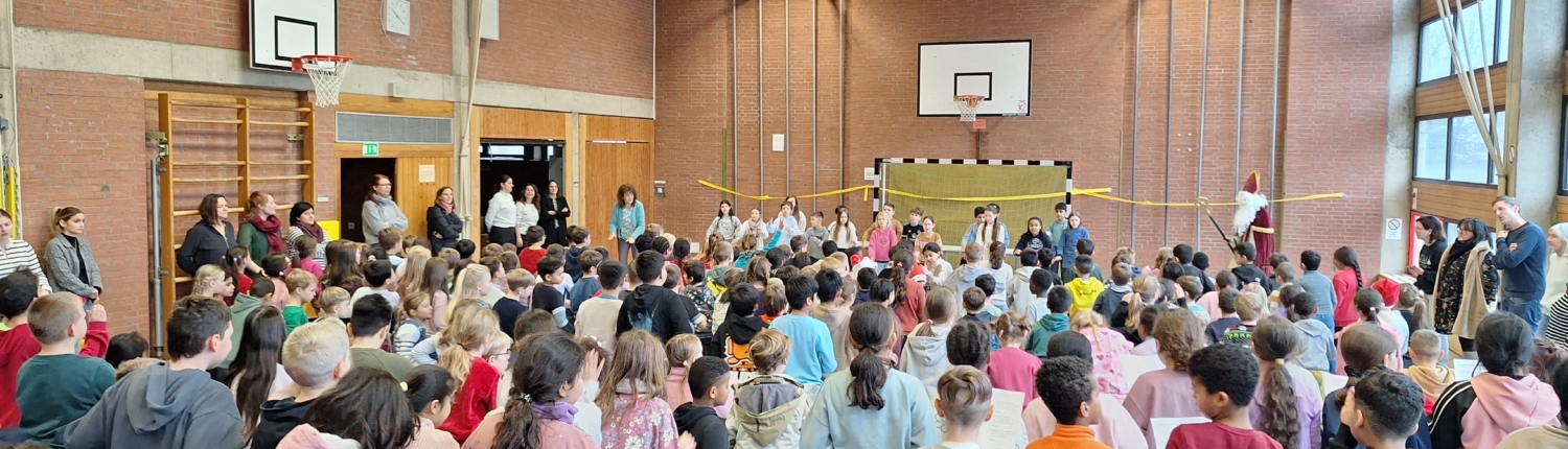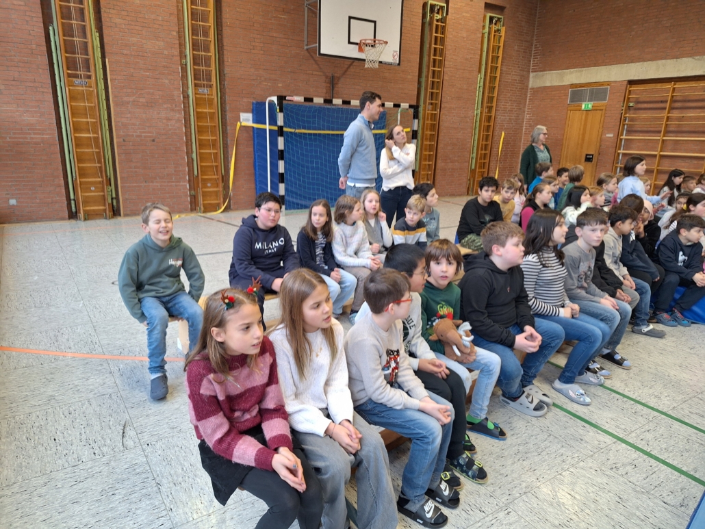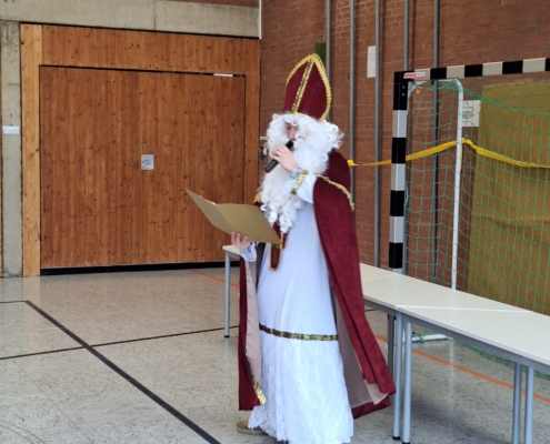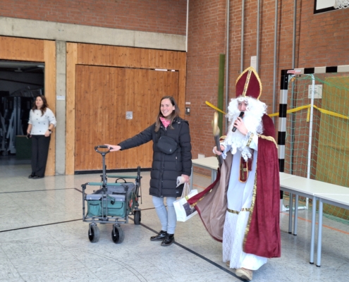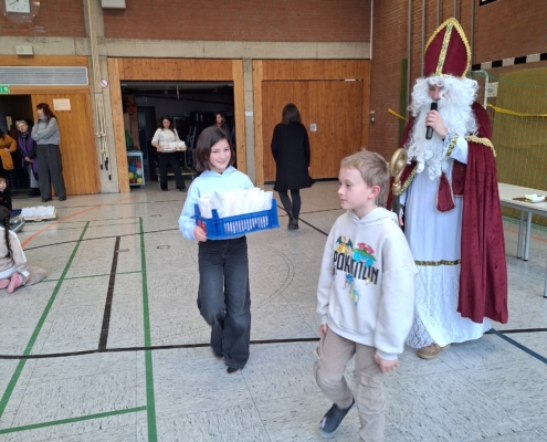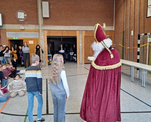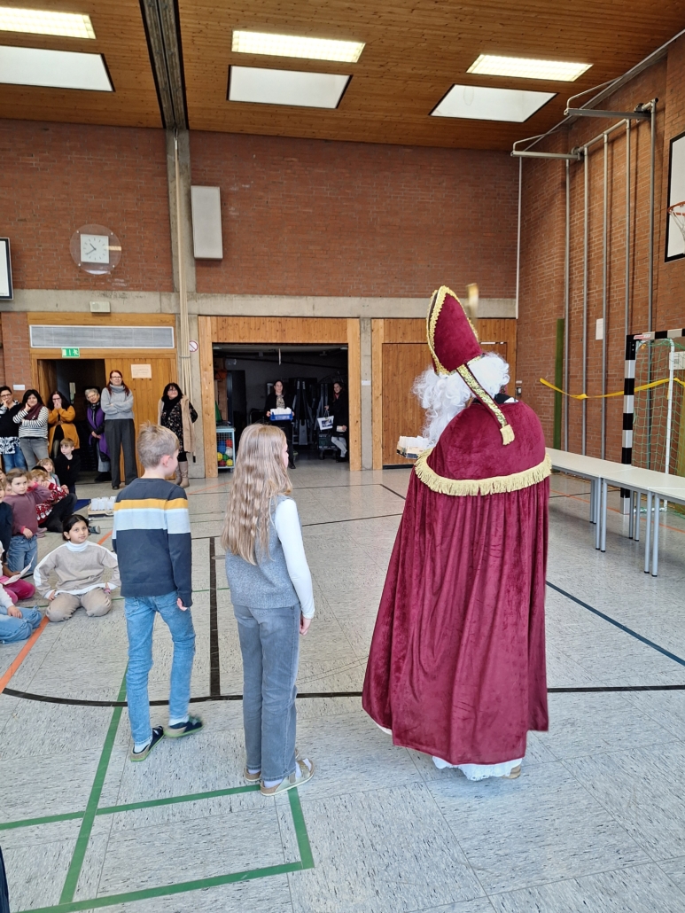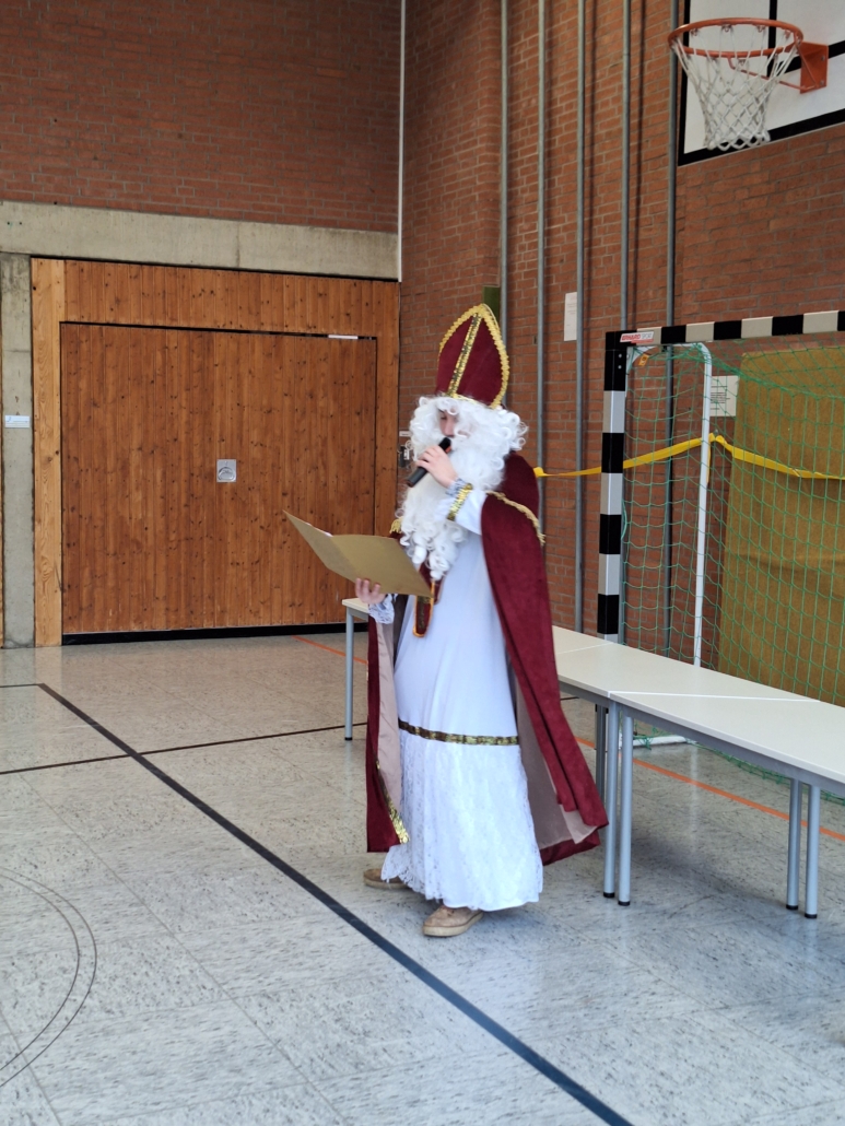 Am Freitag, den 05.12., war wieder große Aufregung in unserer Turnhalle angesagt – der Nikolaus hat seinen Weg zur Martinschule gefunden! Kaum hatte er seinen roten Mantel ausgeschüttelt, begrüßten ihn unsere Schülerinnen und Schüler mit einem so herzlichen und klangvollen Lied, dass selbst unsere sonst unerschütterliche Sekretärin Frau Achtzehn vor Rührung ein Tränchen verdrückte.