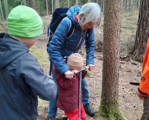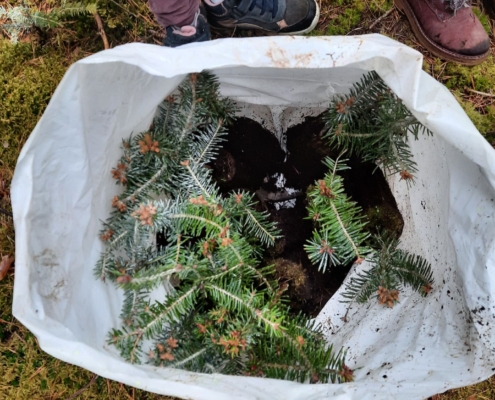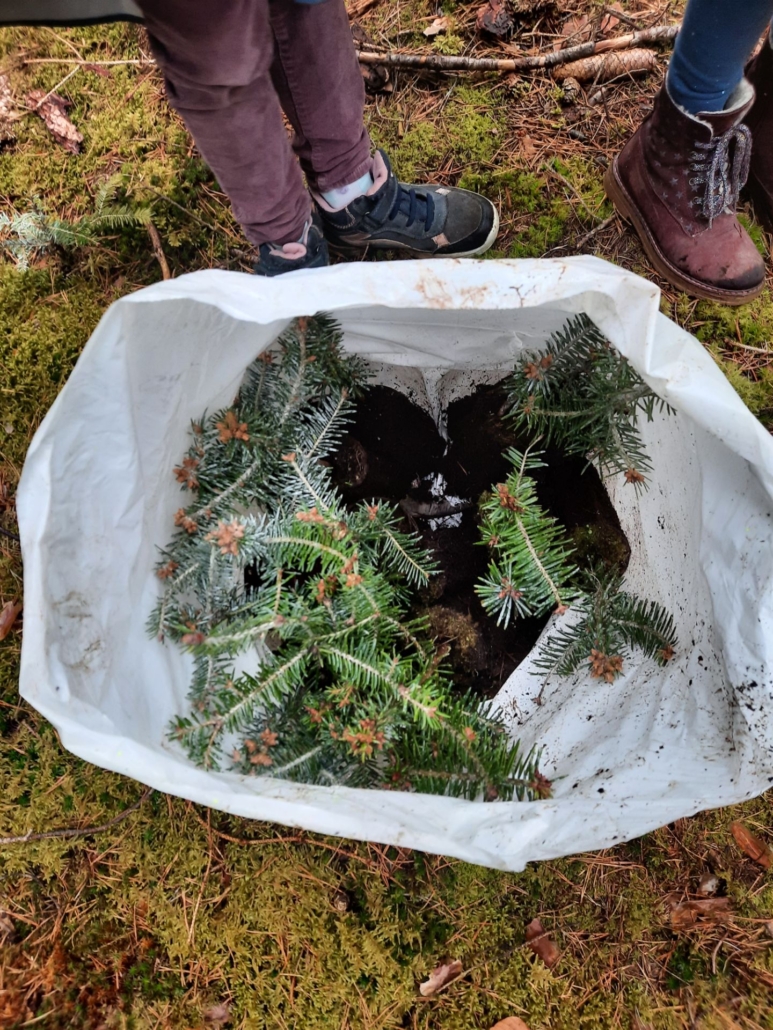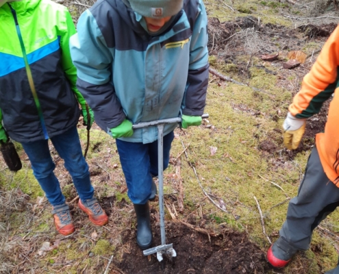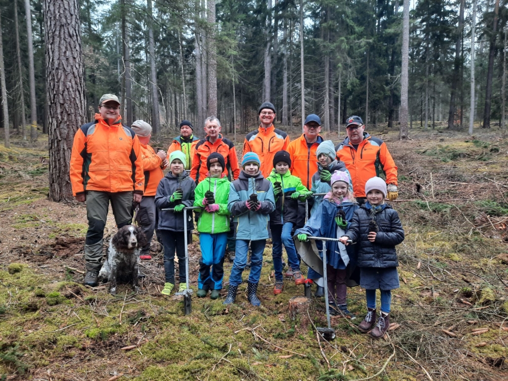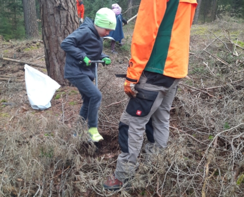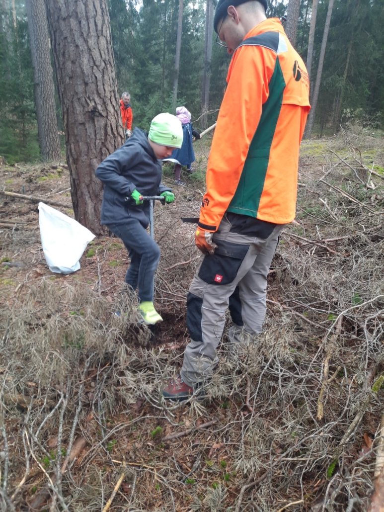 Jetzt ging es ans Werk. Bei uns in Forchheim setzten sieben Kinder das Vorhaben nun tatkräftig um. Sie pflanzten hochmotiviert im Burker Wald mit Hilfe von sieben Mitarbeitern des Forstbetriebs „Bayerische Staatsforsten“ eine Stunde lang kleine Tannenbäume in die vorher ausgestochenen Erdlöcher ein. Immer wieder hieß es: