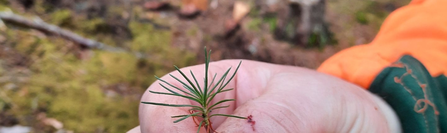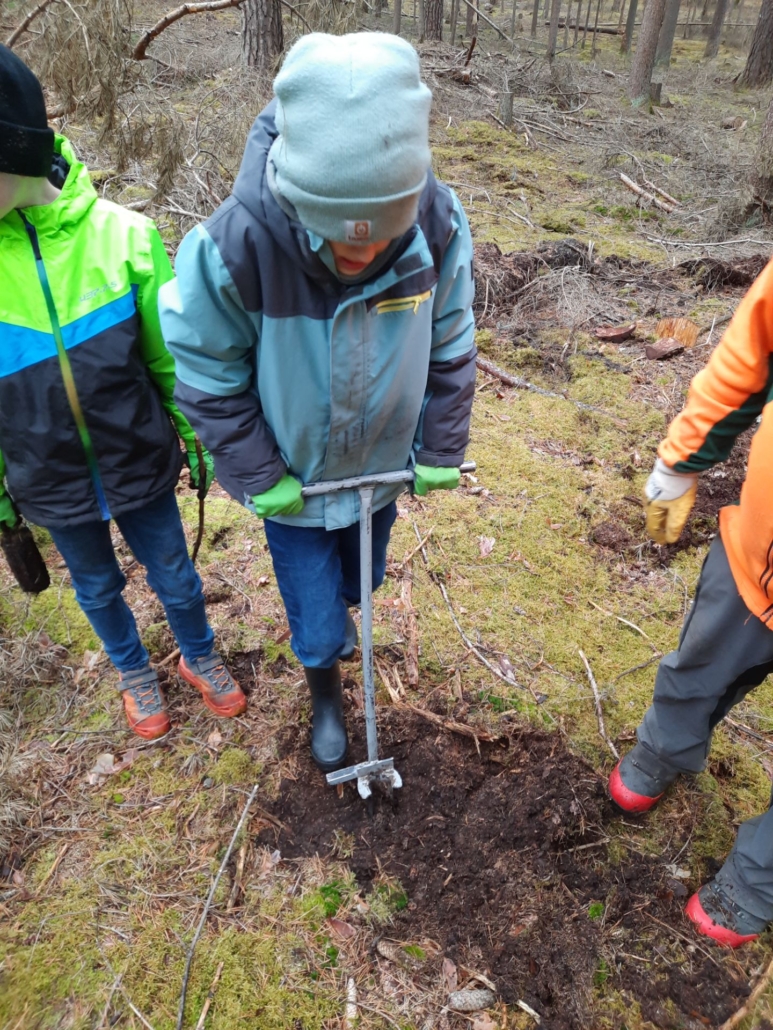 Loch ausheben – bücken – Baum einsetzen – mit Walderde bedecken