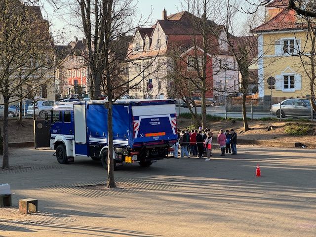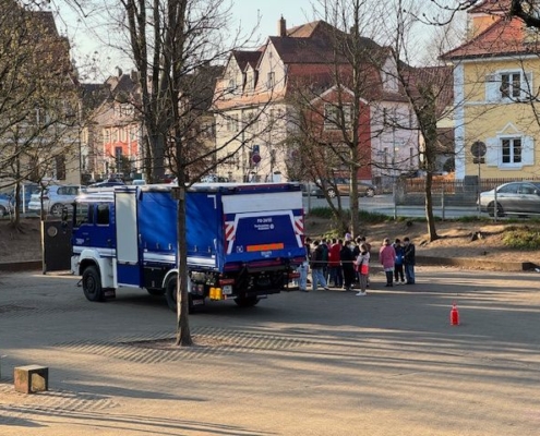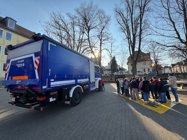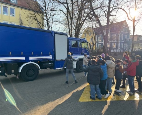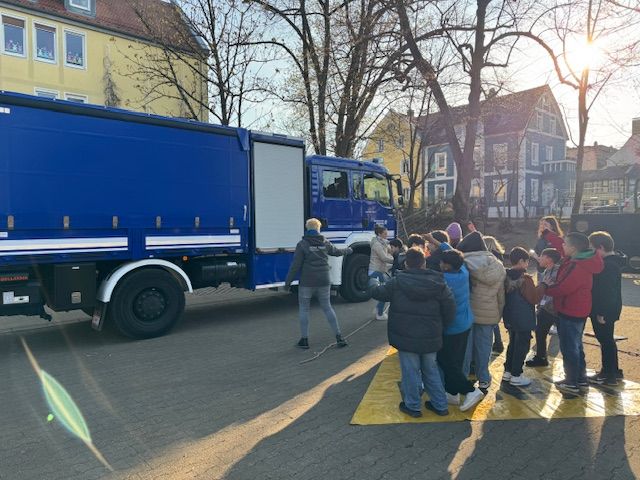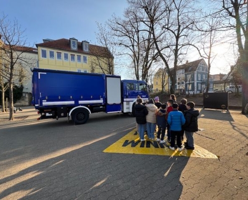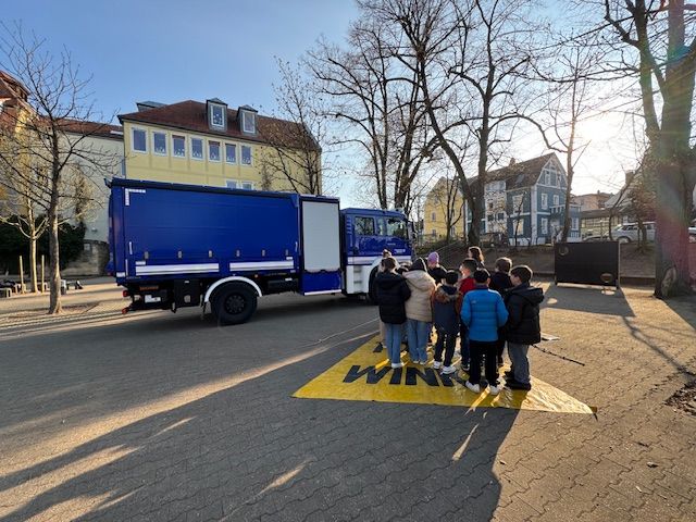 Früh morgens brachte Herr Endres vom THW Forchheim einen großen Laster und parkte ihn auf dem Schulhof. Gleichzeitig kamen zwei Mitarbeiterinnen vom ADAC. Sie erklärten und zeigten in jeweils 60 Minuten den Kindern, wie gefährlich es ist, mit dem Fahrrad neben einem LKW zu fahren. Jede Schülerin